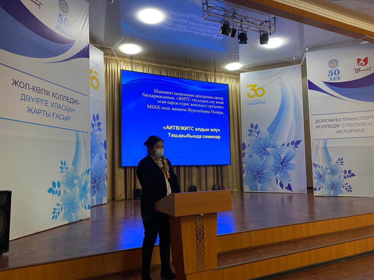 2021 жылдың 03 қарашасында “Жол-көлік колледжі” мекемесі тәрбие ісі жоспарына сәйкес, Шымкент қаласының денсаулық сақтау басқармасының “ЖИТС-тің алдын алу және онымен күресу орталығы” МКҚК-ның маманы Н.Жүргенбаева қатысуымен колледждің 1-4 курс білім алушылары үшін “АИТВ/ЖИТС-ті алдын алу” тақырыбында семинар өтті.