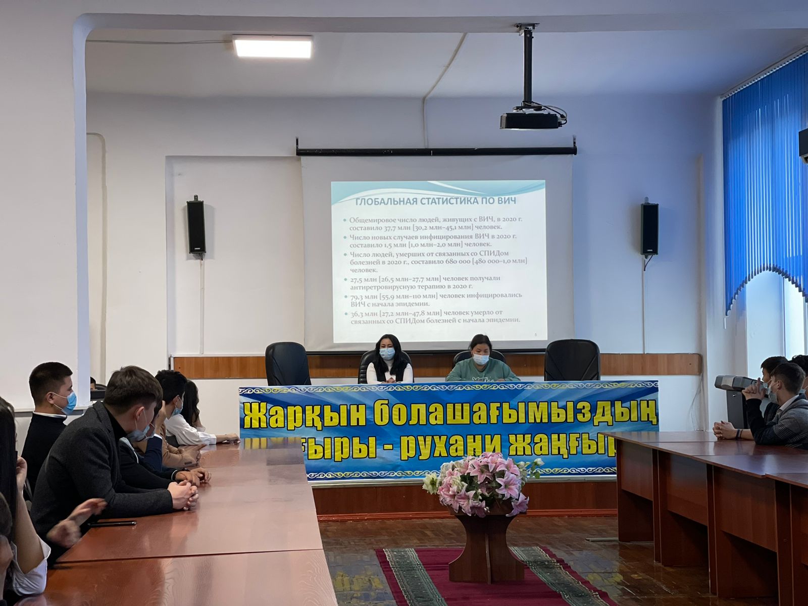 2021 жылдың 10 қарашасында Шымкент қаласы Әл-Фараби ауданы «Жастар ресурстық орталығы»-ның ұйымдастыруымен «Политехникалық колледжі» студенттеріне «Салауатты өмір салтын ұстану қағидалары мен АИТВ/ЖИТС-тің алдын алу шаралары» тақырыбында кездесу өтіп, жастарға түсіндірме жұмыстары жүргізілді. Кездесуге: «ЖИТС – тің алдын алу және оған қарсы күрес жөніндегі орталық» маманы Назира Жургенбаева қатысты.