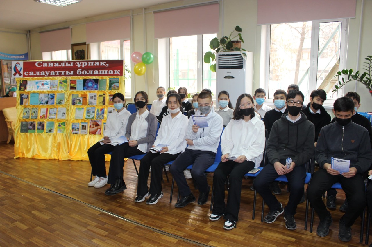 1 желтоқсан – Бүкіләлемдік ЖИТС-ке қарсы күрес күніне орай «Саналы ұрпақ, салауатты болашақ» атты мамандар кеңесі Ақпан батыр атындағы №10 мектеп оқушылары арасында өткізілді. Іс-шараға Шымкент қаласының денсаулық сақтау басқармасының «ЖИТС – тің алдын алу және оған қарсы күрес жөніндегі орталық» МКҚК – нің маманы Назира Жүргенбаева қатысты. Оқушылардың білімдерін молайтып, түсініктерін кеңейту үшін осы дерттен сақтану жолдарынан кең көлемді мәлімет беріп, ауруға қарсы күрес шараларымен таныстырды. «Әрбір жаманшылықтың жағасында тұрып, адамның адамдығын бұзатын жаманшылықтан бойын жинақтау, бұл адамға нұр болады» деп Абай атамыз айтқандай, танымдық әдеби шығармаларды оқуға, салауатты өмір салтын ұстану жолдарын насихаттады.