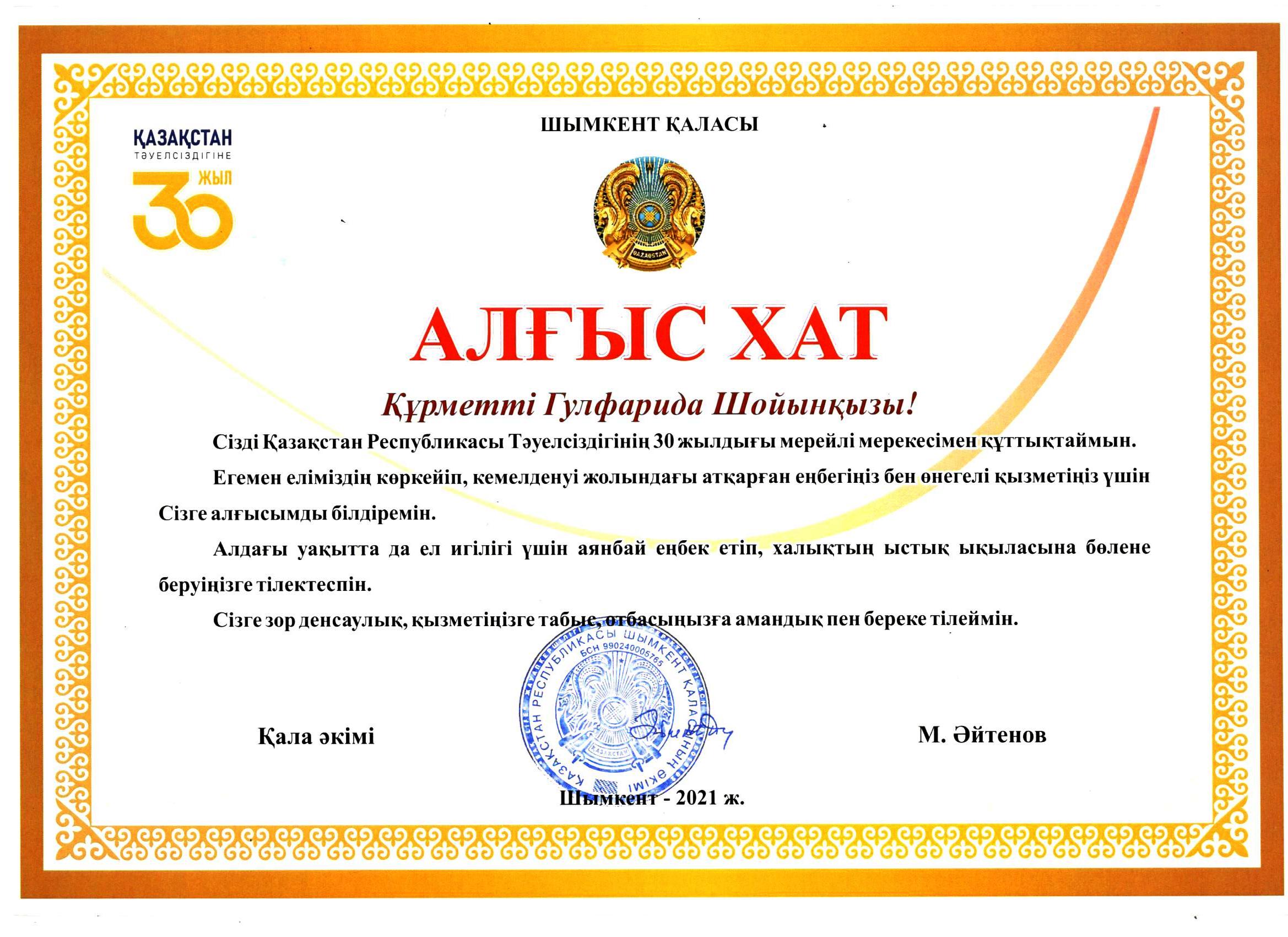 Шымкент қаласының ДСБ «ЖИТС-тің алдын алу және оған қарсы күрес жөніндегі орталық» МКҚК ұжымы ҚР Тәуелсіздігінің 30 жылдығын атап өтті. Іс-шара барысында: отыз жыл ішінде еліміздің ЖИТС-ті диагностикалау, емдеу және профилактикасындағы жетістіктері жайында бейнеролик көрсетіліп, баяндама оқылды. Қазақстан Республикасының Тәуелсіздік күніне орай, орталықтың мамандары сіңірген еңбектері үшін марапатталды. Эпидемиолог дәрігер Байділдаева Ұ.С. Қазақстан Республикасы Президентінің 2021 жылғы 2 желтоқсандағы Жарлығы бойынша «Халық алғысы» медалімен наградталды. Орталықтың Кәсіподақ ұйымының төрайымы Абдрашова Г.Ш. Шымкент қаласының әкімінен «Алғыс хатпен», Ақпараттық және АИТВ індетін компьютерлік бақылау бөлім меңгерушісінің міндетін атқарушы Жумашев К.О., бас есепшінің міндетін атқарушы Усенбаев Е. Ж., эпидемиолог көмекшісі Джанабаева Л.М. Шымкент қаласы ДСБ – ның «Құрмет грамотасымен» марапатталды.