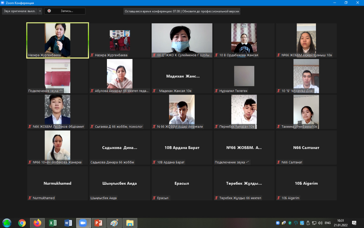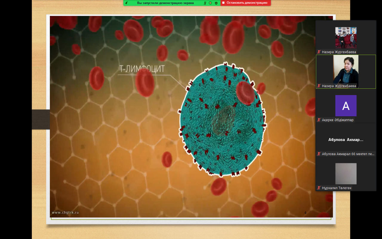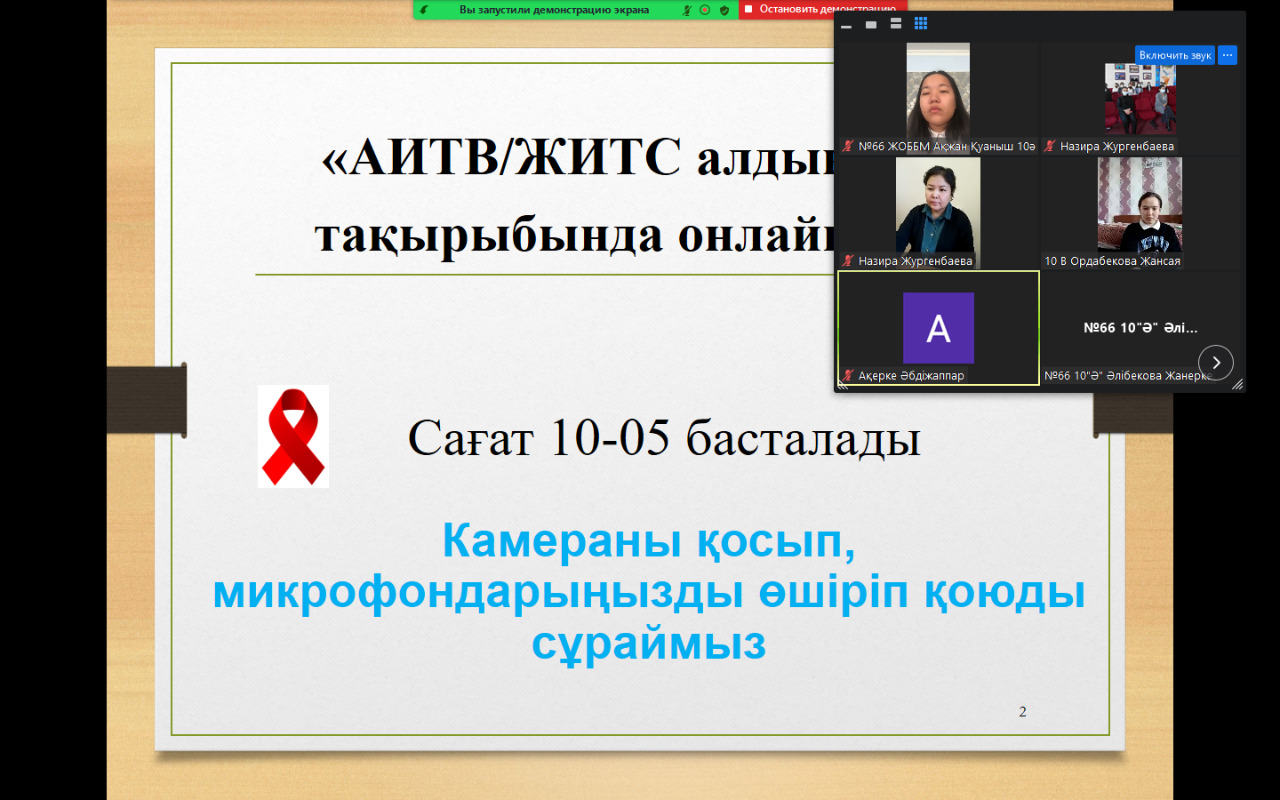 2022 жылдың 21 қаңтар күні Шымкент қаласының денсаулық сақтау басқармасының «ЖИТС-тің алдын алу және онымен күресу орталығы» МКҚК-ның маманы Н.Жүргенбаева қатысуымен №66 жалпы орта мектеп оқушылары үшін «АИТВ/ЖИТС-ті алдын алу» тақырыбында онлайн дәріс өтті.