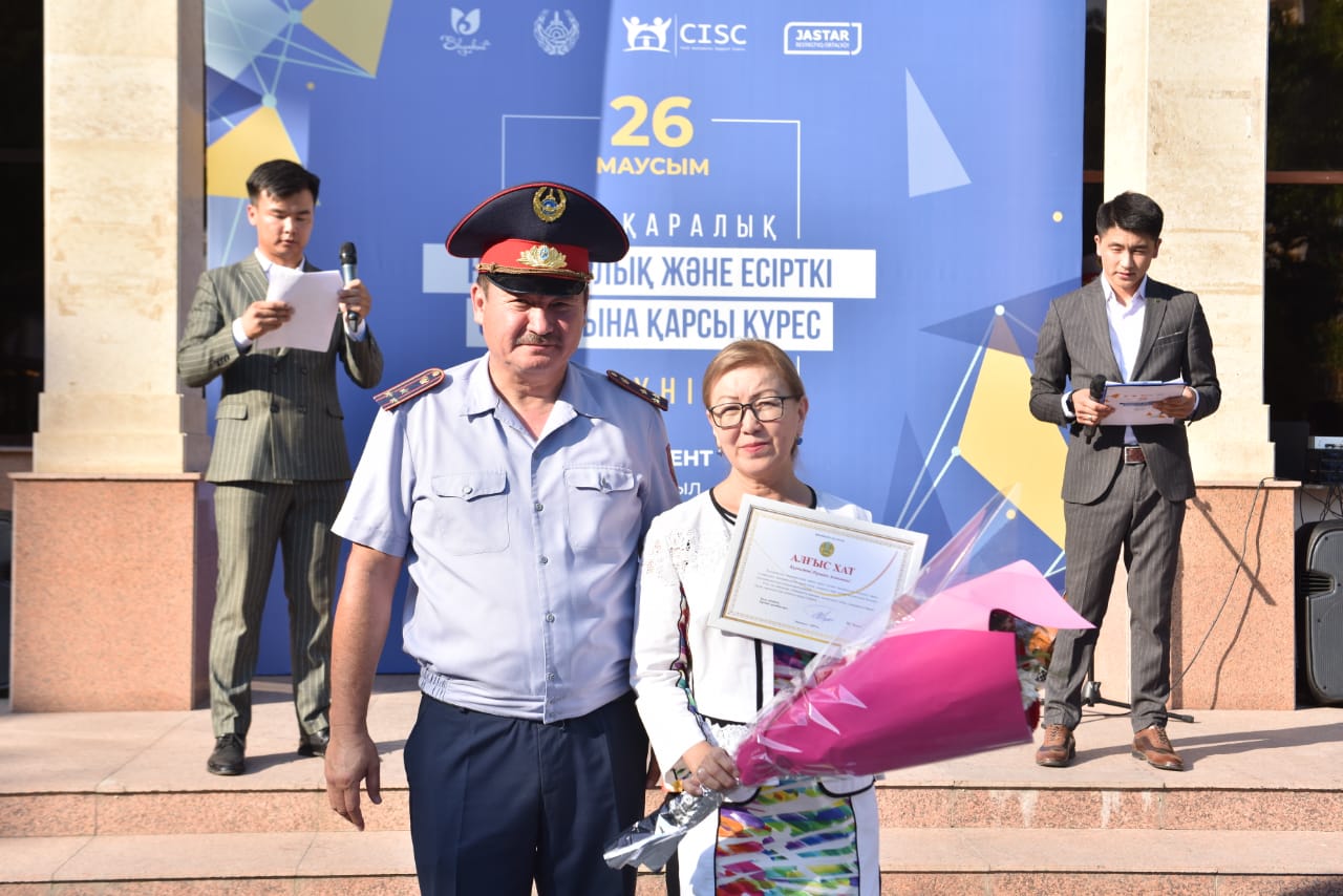 Азаматтарға салауатты өмір салтын насихаттап, қоғамды нашақорлыққа, заңсыз есірткі айналымына тосқауыл қою мақсатында ұйымдастырылған іс-шара барысында бір айлық профилактикалық жұмыс қорытындыланып, белсенділік танытқан сала мамандары марапатталды.