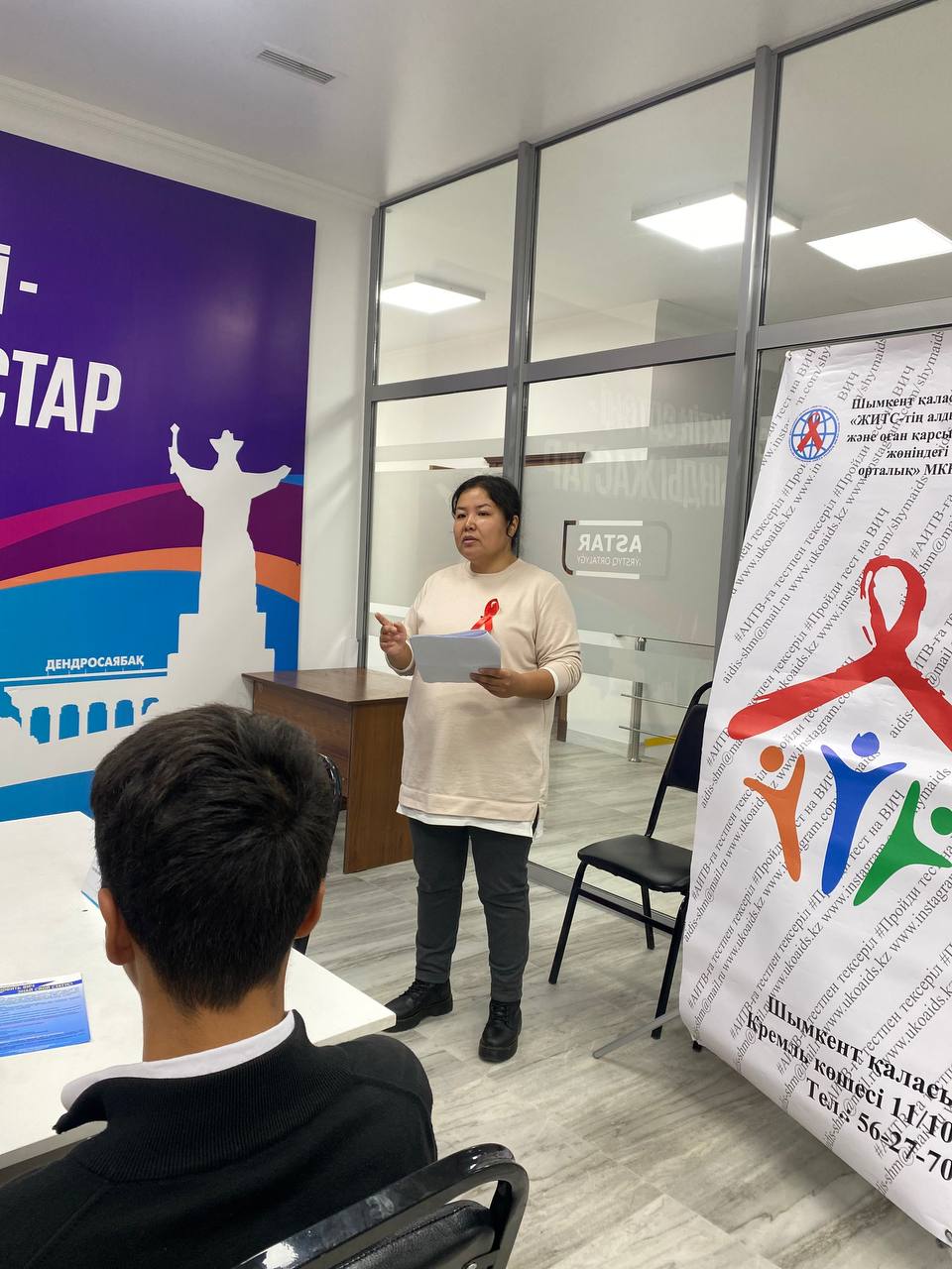 Дүниежүзілік ЖИТС-пен күрес күніне орай Шымкент қаласының ДСБ «ЖИТС-тің алдын алу және оған қарсы күрес жөніндегі орталық» МКҚК-нің Шымкент қаласы ішкі саясат және жастар істері жөніндегі басқармасының «Жастар ресурстық орталығымен» бірлескен жоспары бойынша Қаратау ауданы жастар ресурстық орталығында АИТВ-инфекцияның алдын алуына арналған, жастар арасында науқан өтті.