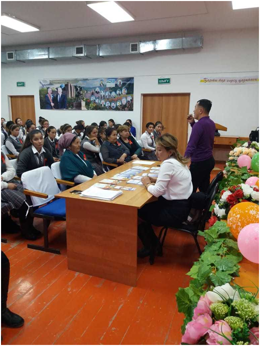 «ЖИТС-тің алдын алу және оған қарсы күрес жөніндегі орталық» Түркістан қаласы №2 бөлімшесінің дәрігер эпидемиологі Д.Рыскелдиев кездесу барысында студенттерге АИТВ-ның берілу жолы, алдын алу шаралары жайында баяндама оқыды, АИТВ-мен өмір сүретін адамдарды кемсіту мен шеттетудің алдын алу бойынша мәлімет берді. Студенттер арасында тренинг ойындар ойнатылды. Видиороликтер көрсетіліп, кітапшалар таратылды.