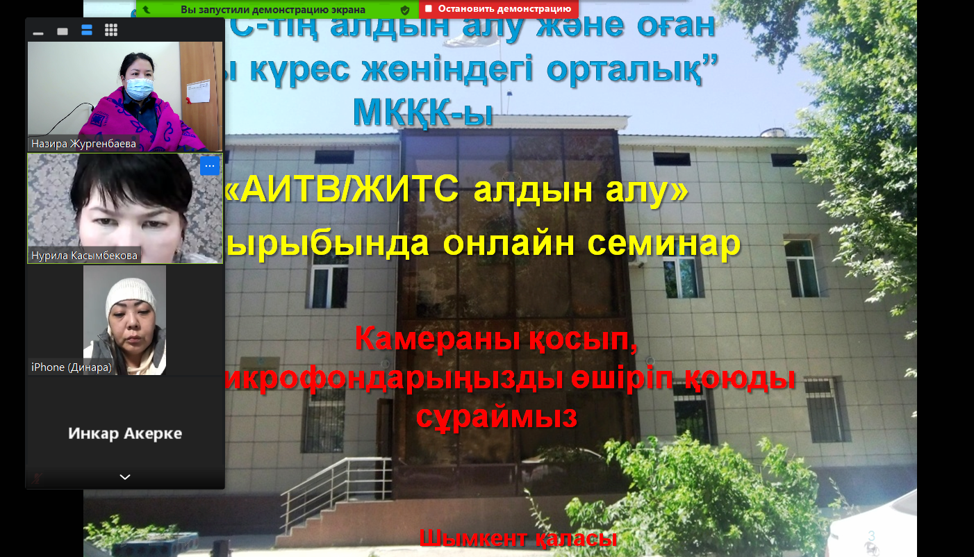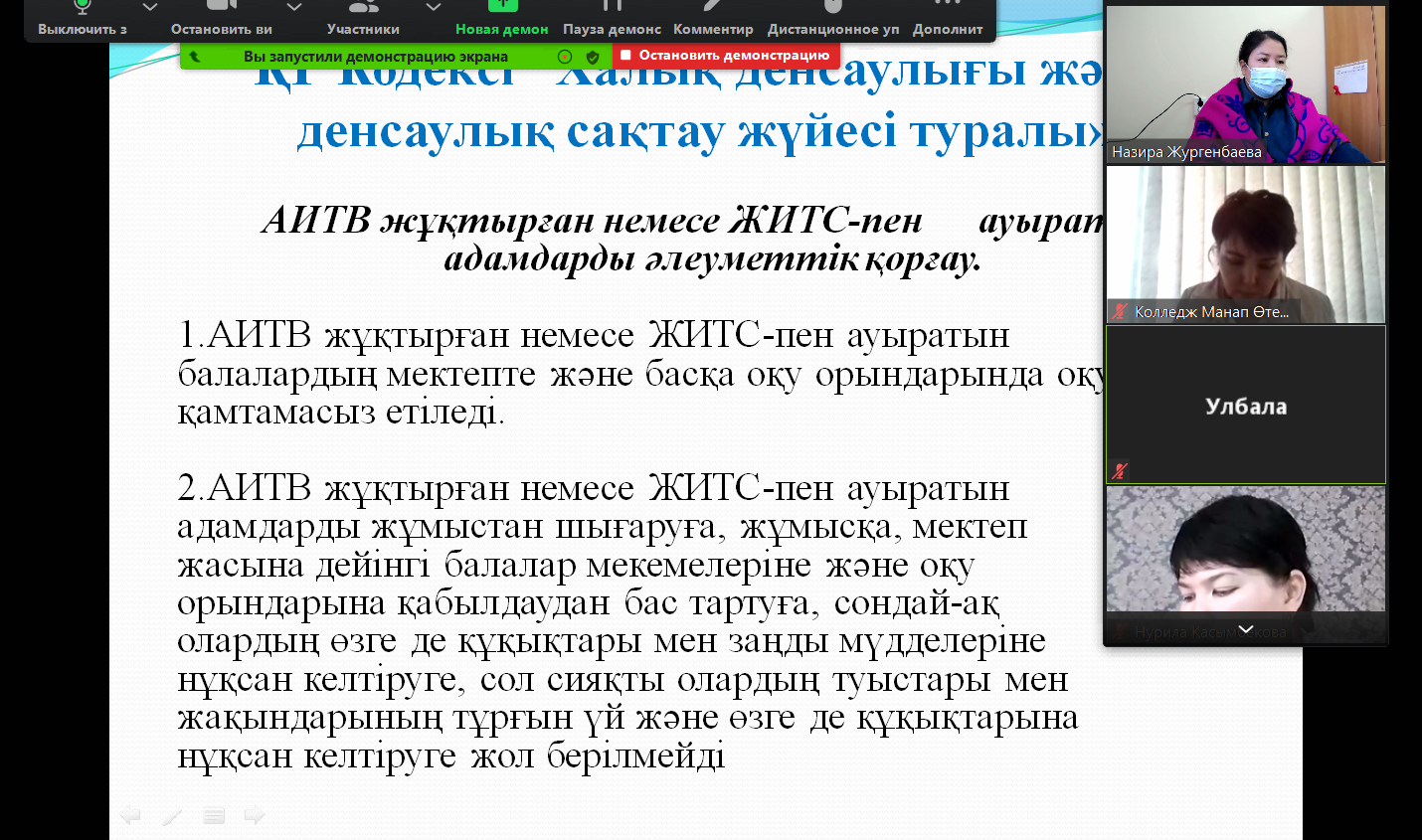 Манап Отебаев атындагы жоғары жана технологиялар колледжiнің студенттеріне қыздарға арналған онлайн жиналысы барысында ЖИТС-тің алдын - алу және оған қарсы күрес жөніндегі орталығының мұғалімі Н.Жургенбаева қатысып, "АИТВ/ЖИТС-тің алдын - алу" атты баяндамасын жасады. Студенттер іс-шара барысында АИТВ/ЖИТС алдын-алуы туралы шынайы ақпарат ала отырып, физиологиялық және әлеуметтік тұрғыдан бей-берекет жыныстық қатынасқа түсетін және есірткі мен психоактивті заттарды қолданатын жастарды күтіп тұрған қиындықтар жайлы сұрақтарды талқылап, тұжырым жасады.