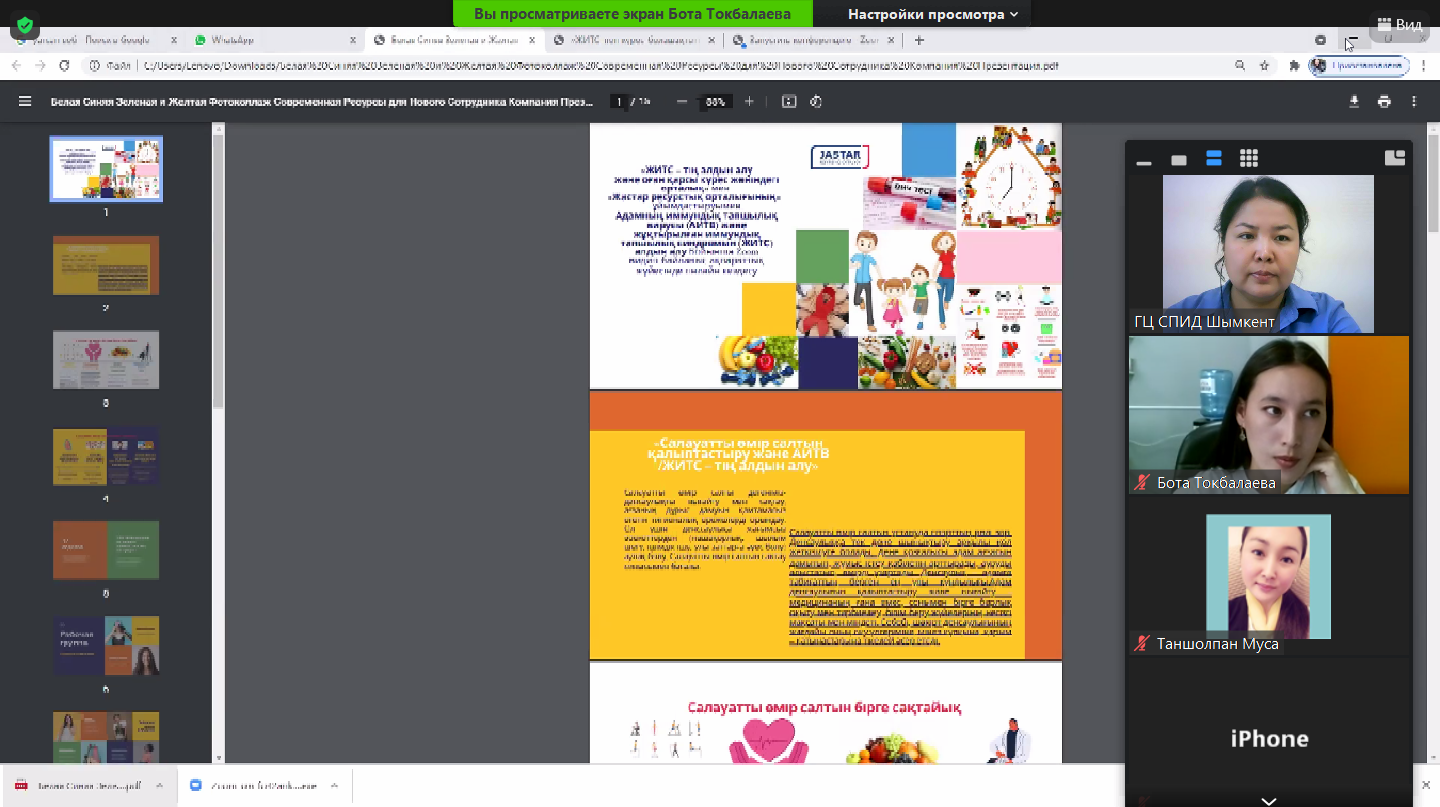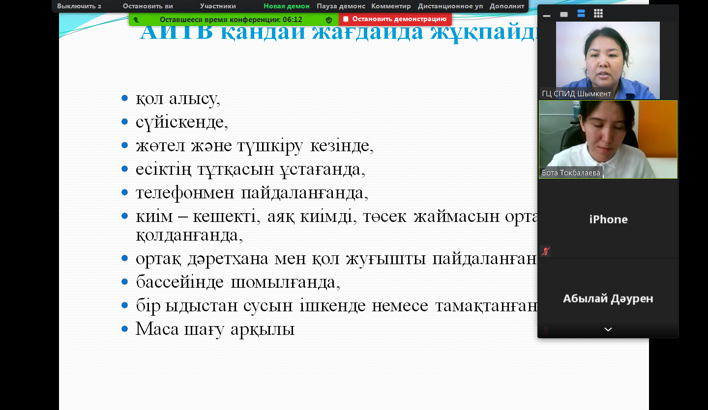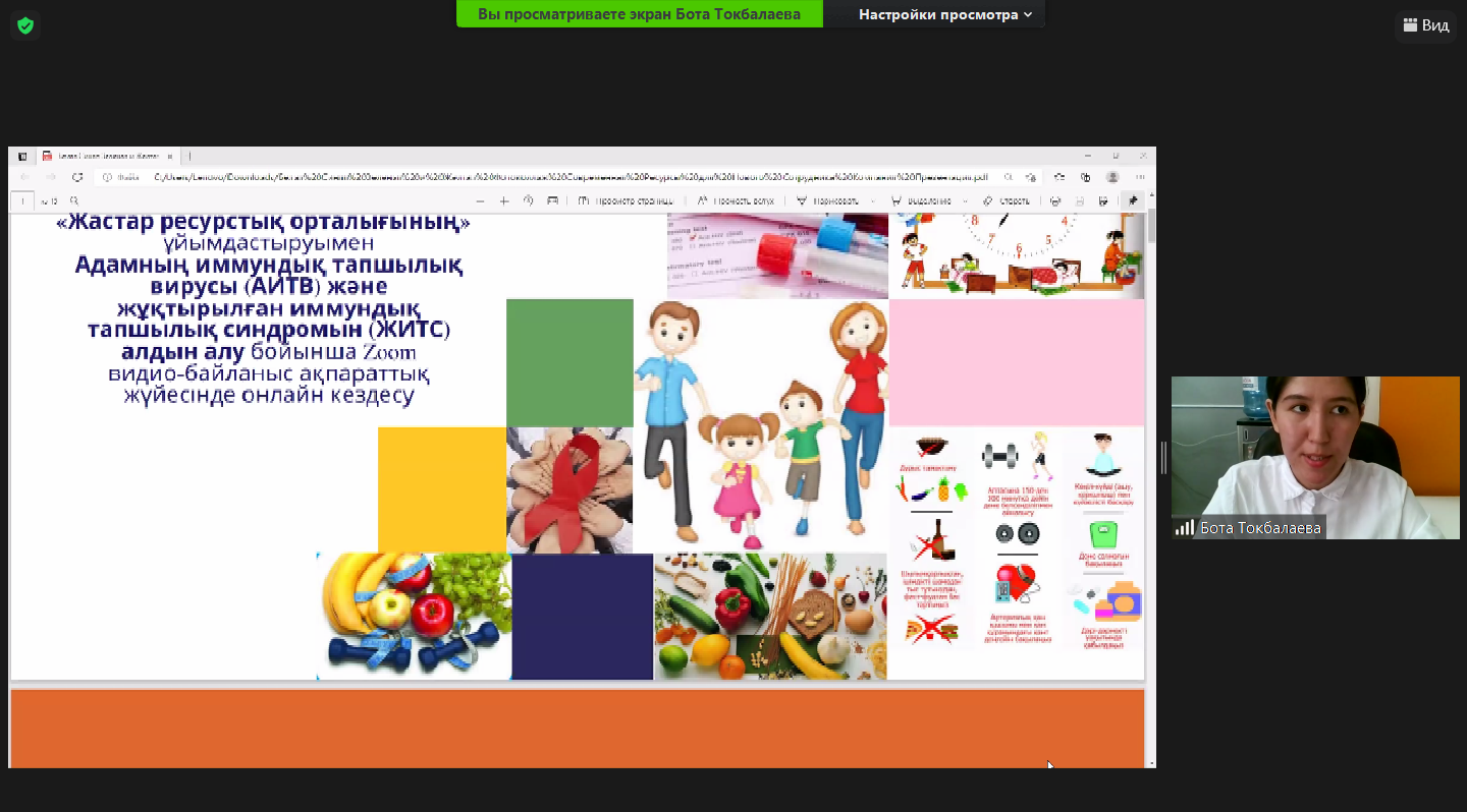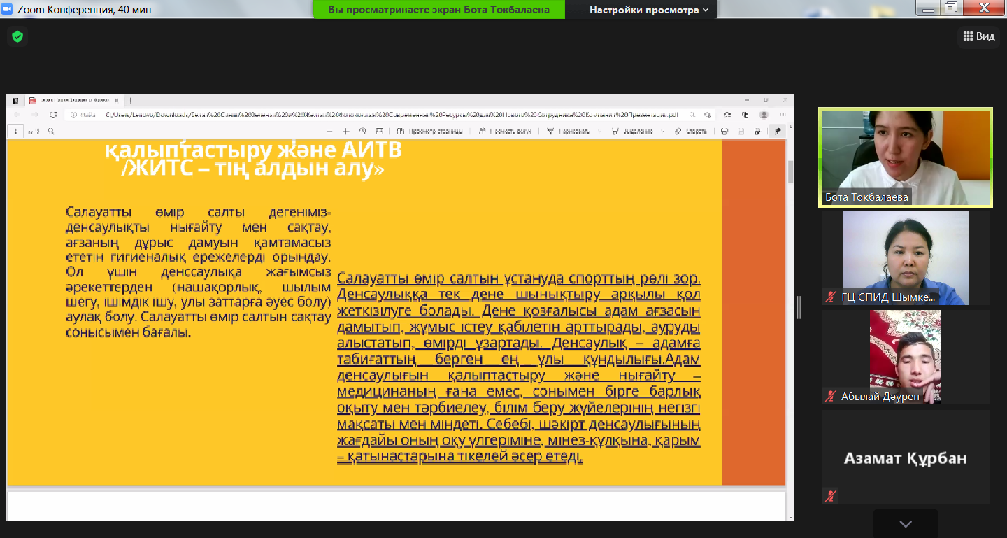 «Жол-көлік колледжiнің» студенттеріне арналған онлайн семинары барысында ЖИТС-тің алдын - алу және оған қарсы күрес жөніндегі орталығының мұғалімі және Шымкент қаласының ішкі саясат және жастар істері жөніндегі басқармасының «Жастар ресурстық орталығының» маманы қатысып, «АИТВ/ЖИТС-тің алдын – алу» атты баяндамаларын жасады. Студенттер іс-шара барысында онлайн сауалнама сұрақтарына жауап беріп, АИТВ/ЖИТС туралы шынайы ақпарат ала отырып, АИТВ-мен өмір сүруші адамның құқықтарына құрмет көрсетуді үйренді.