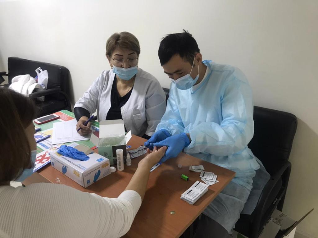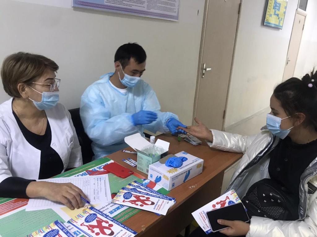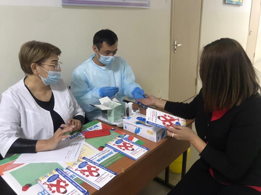 12.10.2021 Шымкент қ. ДСБ-ның « ЖИТС тің алдын алу және оған қарсы күрес жөніндегі орталық» MKҚК-нің қызметкерлері ТОО «Долана бұлақ» медицина орталығында, халық арасында АИТВ/ЖИТС инфекциясының алдын алу мақсатында келушілерге жедел - тест жүргізілді.Жұмыс барысында тестіге дейін және тестіден кейінгі кеңес беріліп,ақпараттық материалдар таратылды.