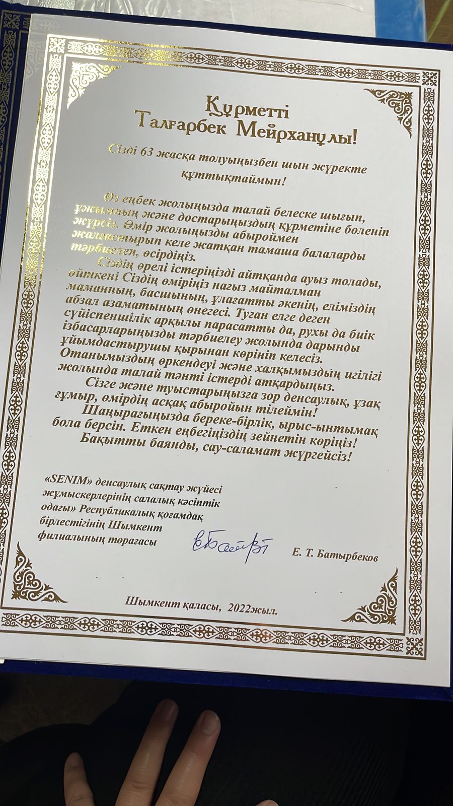 Шымкент қаласы ЖИТС орталығының ұжымы, орталықтың бас дәрігері Т.Мейрхановты 63 жасқа толған төл мерекесімен құттықтады. Жиын барысында ««SENIM» денсаулық сақтау жүйесі жұмыскерлерінің салалық кәсіптік одағы» Республикалық қоғамдық бірлестігінің Шымкент филиалының төрағасы Е.Т. Батырбеков, Т.Мейрхановты халық үшін сіңірген елеулі еңбектері үшін «Алтын дәрігер» медалімен марапаттады. ЖИТС орталығының ұжымы да өз лебіздерін білдіріп, атқарған ерен еңбектеріне ризашылықтарын білдірді.