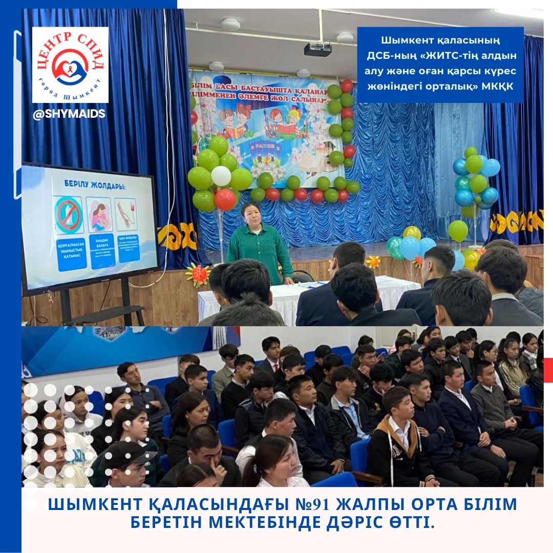 Шымкент қаласының ДСБ «ЖИТС-тің алдын алу және оған қарсы күрес жөніндегі орталық» МКҚК-нің ұйымдастыруымен, «АИТВ-инфекциясын жастар арасында алдын алу» тақырыбында, №91 жалпы орта білім беретін мектебінің жоғары сынып оқушыларымен кездесу өтті.