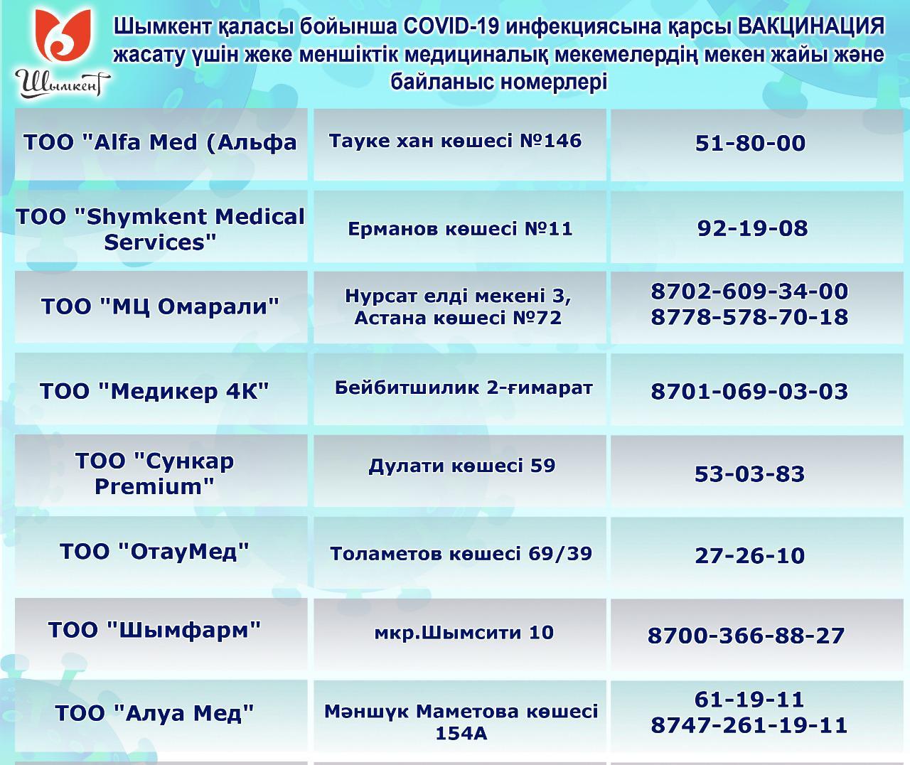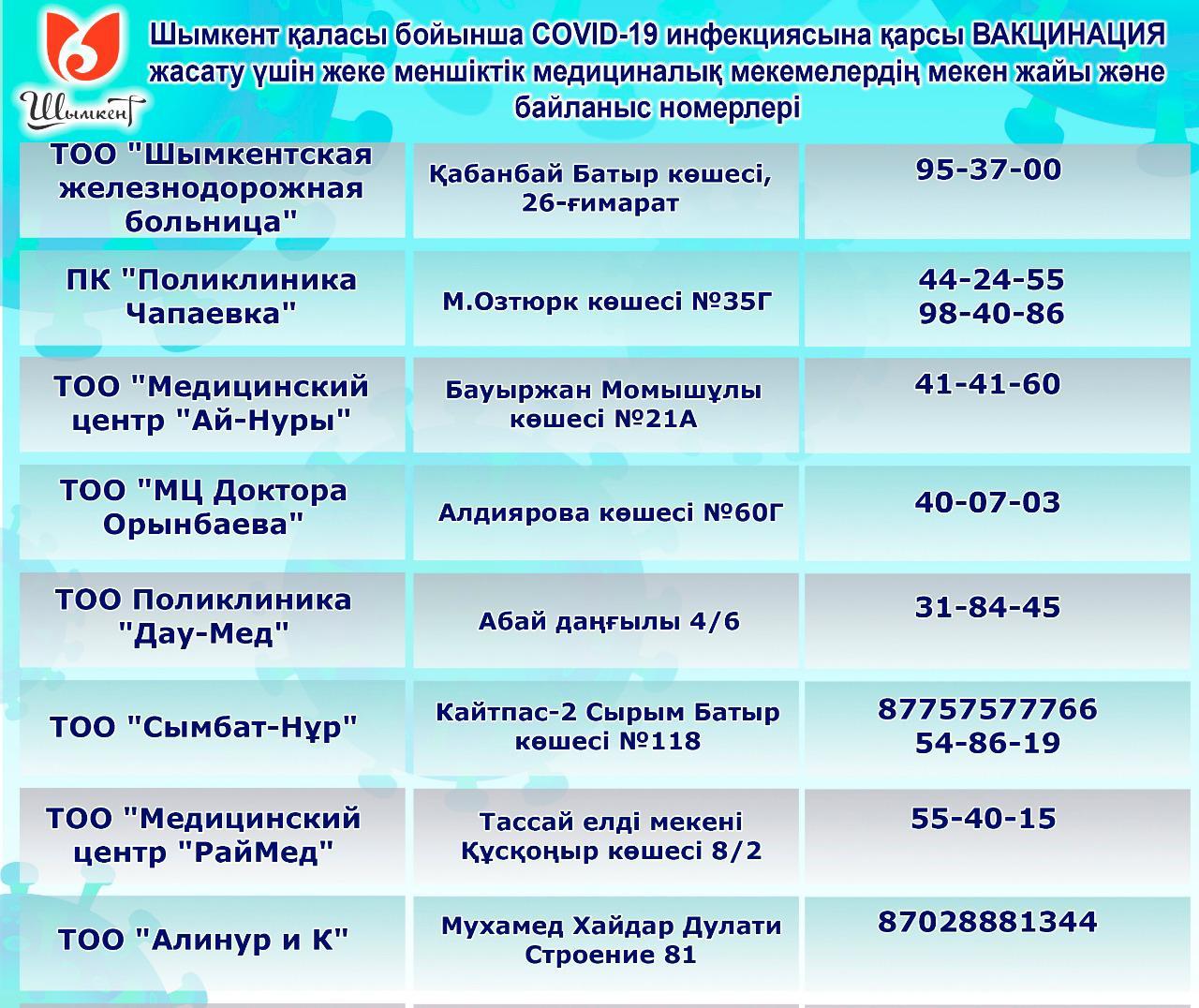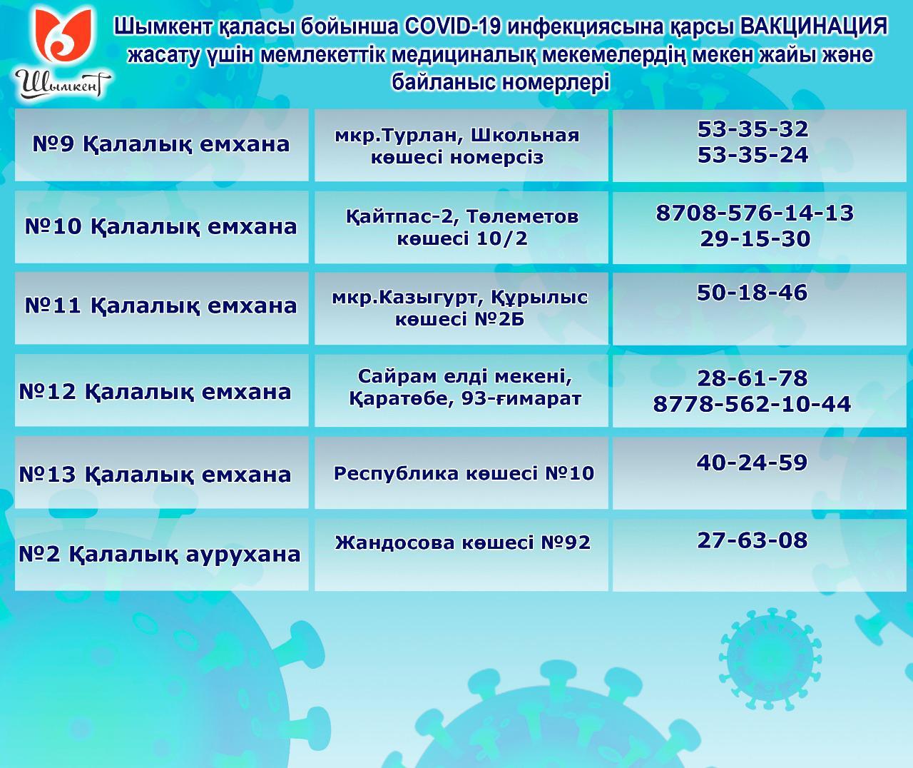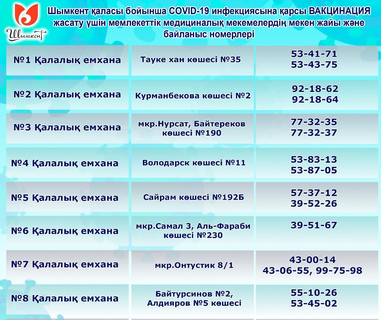 Шымкент қаласы бойынша COVID-19 инфекциясына қарсы егу пунктерінің мекен-жайын біле жүріңіздер. Ковидке қарсы вакцина салдырғысы келген азаматтарға жергілікті емханаларында екпе егу жұмыстары жүргізіледі.