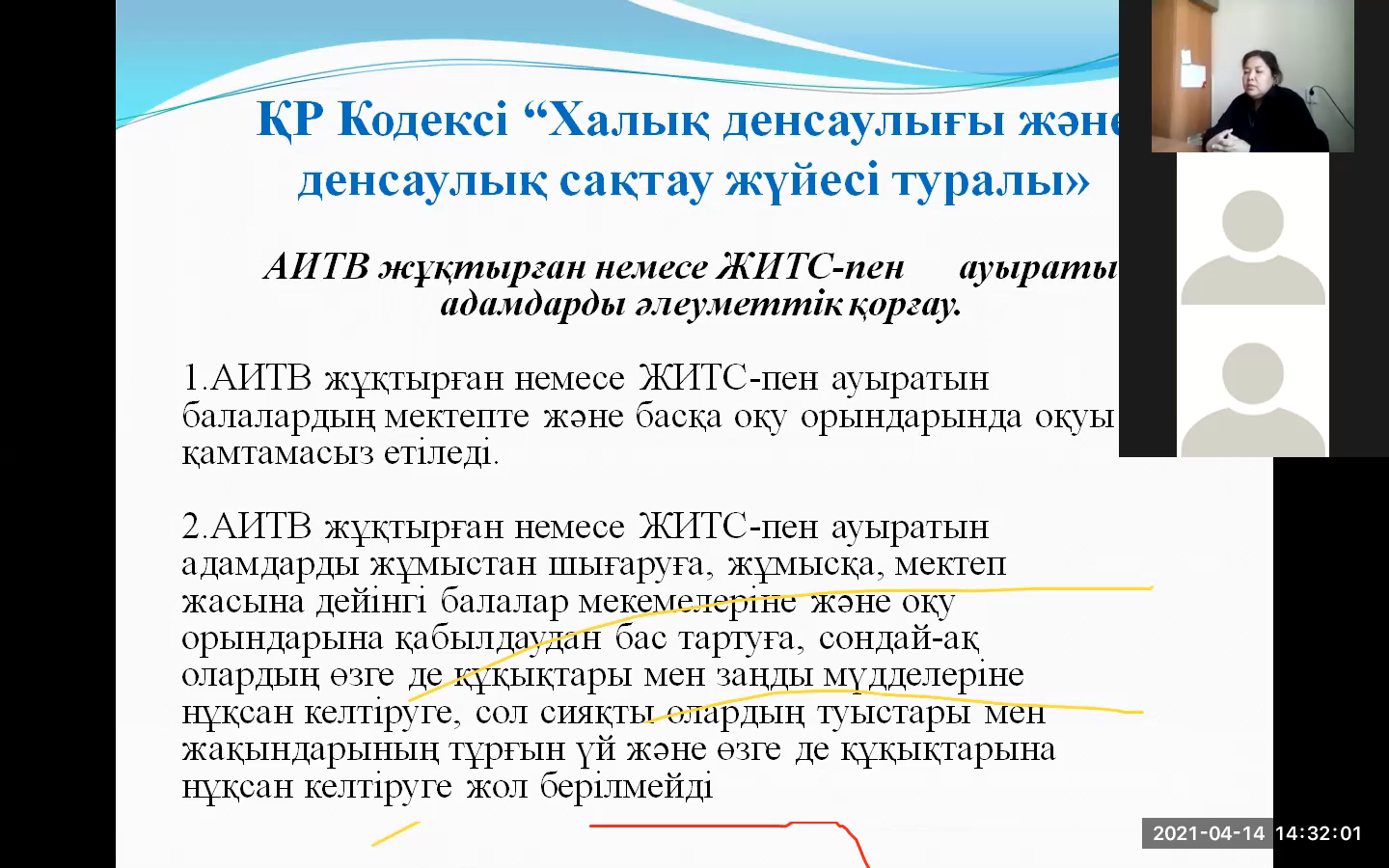 Техникалық колледжiнің студенттеріне арналған онлайн семинары барысында ЖИТС-тің алдын - алу және оған қарсы күрес жөніндегі орталығының мұғалімі қатысып, "АИТВ/ЖИТС-тің алдын - алу" атты баяндамасын жасады.