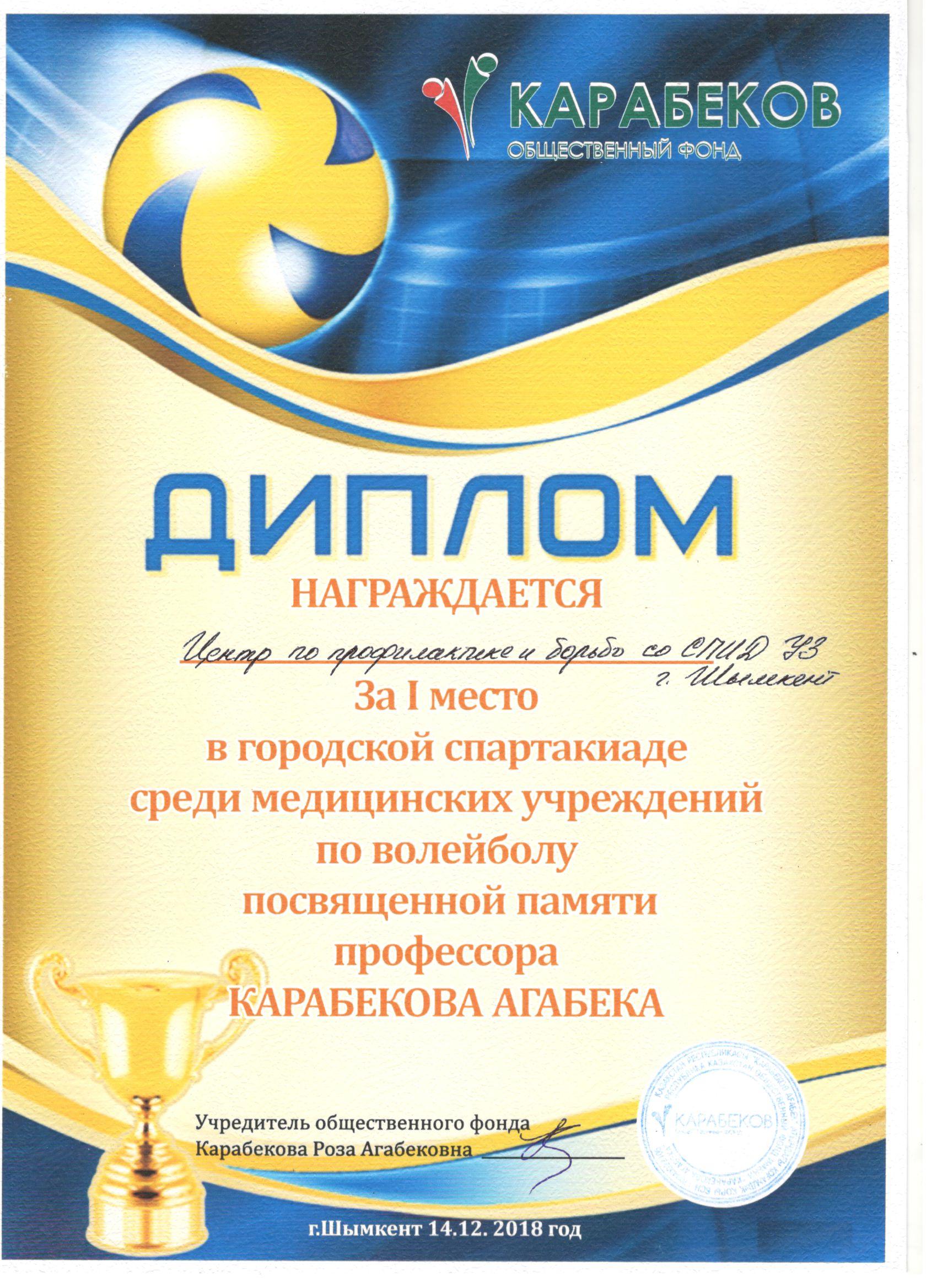 14.12.2018 ж Мемлекеттік сыйлықтың лауреаты, м.ғ.д. профессор А.Қ.Қарабековті еске алу құрметіне арналған, медицина қызметкерлері арасында өткен волейболдан қалалық II-ТУРНИРІНЕН бас жүлдені ұтып алдық.