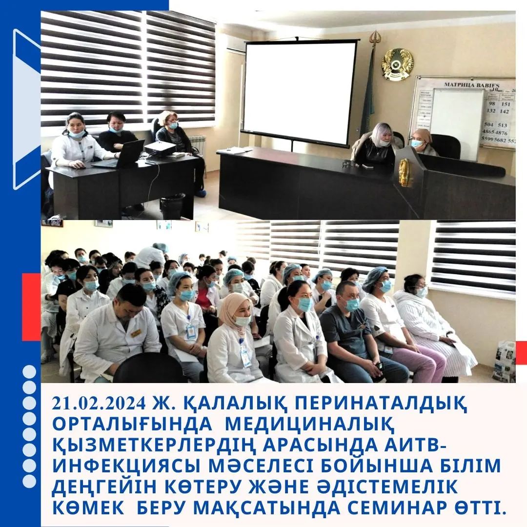 📢 21.02.2024 ж. Қалалық перинаталдық орталығында медициналық қызметкерлердің арасында АИТВ-инфекциясы мәселесі бойынша білім деңгейін көтеру және әдістемелік көмек беру мақсатында семинар өтті.